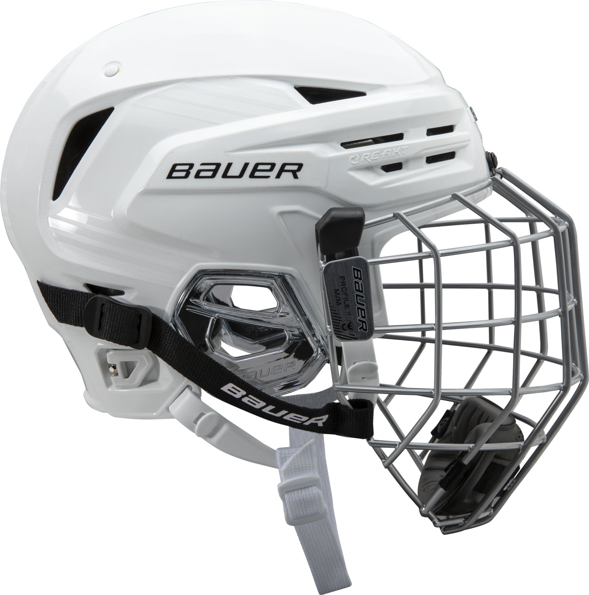 Bauer Re-Akt 85 Combo jääkiekkokypärä valkoinen. Erittäin hyvin suojaava kypärä sarjapelaajille. Huippuistuvuus takaa mukavan tuntuman ja suojaavuuden iskuissa.